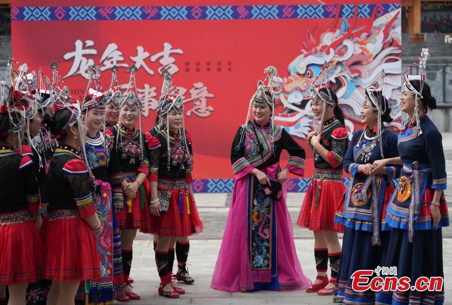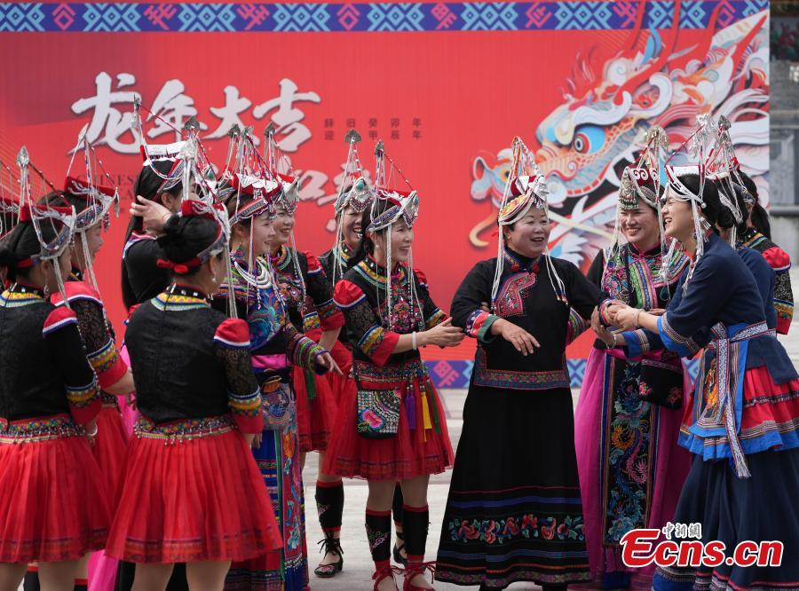 Women of She ethnic group in traditional costumes participate in a rehearsal for a local Spring Festival gala at Cangnan County of Wenzhou City, east China's Zhejiang Province, Jan. 30, 2024. (Photo: China News Service/Mao Jianjun)