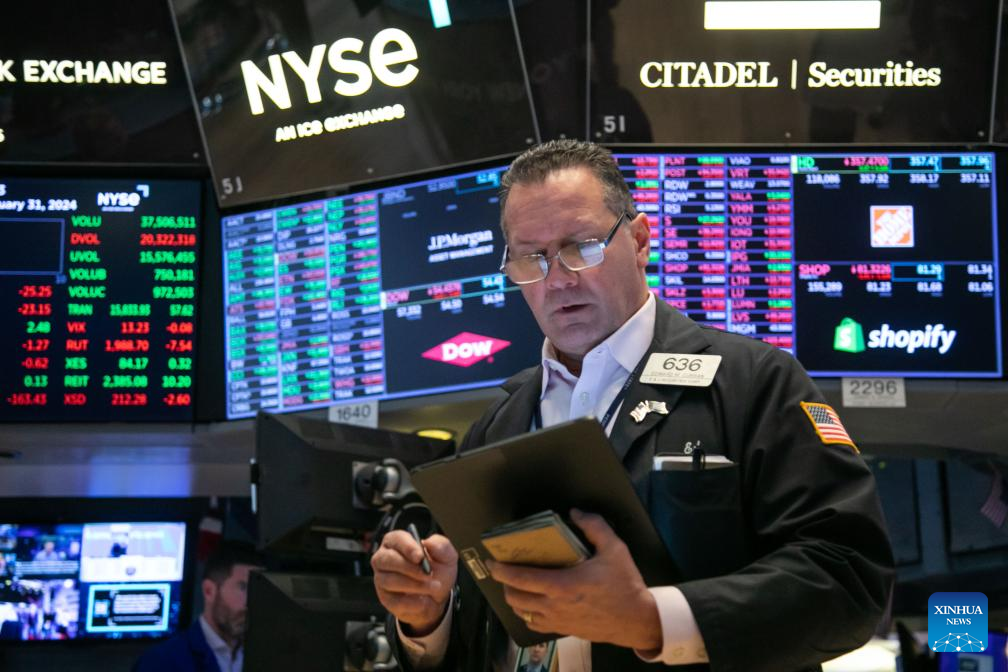 A trader works on the floor of the New York Stock Exchange in New York, the United States, on Jan. 31, 2024. U.S. stocks ended lower on Wednesday. The Dow Jones Industrial Average fell 317.01 points, or 0.82 percent, to 38,150.3. The S&P 500 sank 79.32 points, or 1.61 percent, to 4,845.65. The Nasdaq Composite Index shed 345.89 points, or 2.23 percent, to 15,164.01. (Photo by Michael Nagle/Xinhua)