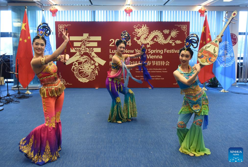 Performers dance during a reception to celebrate the Spring Festival at Vienna International Center in Vienna, Austria, Jan. 31, 2024. A reception in celebration of the Spring Festival, co-hosted by China's Permanent Mission to the UN in Vienna and UN Vienna Chinese Culture Club, was held here on Wednesday. It was the first such event staged at the UN Office at Vienna by the permanent mission. (Xinhua/He Canling)