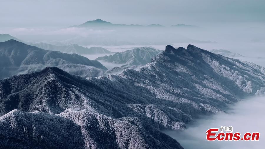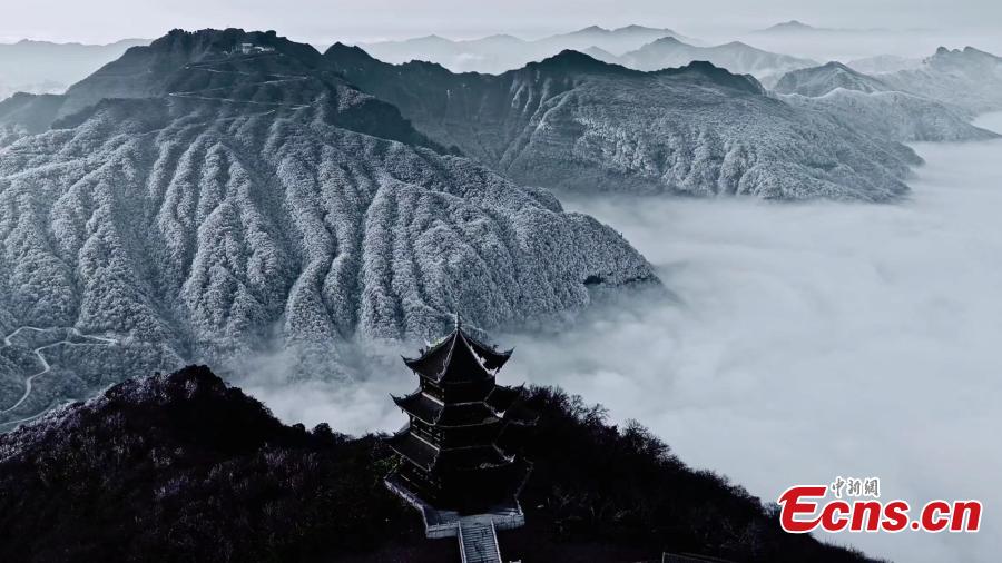 Picturesque scenery of clouds-shrouded Longtou Mountain with snow in Hanzhong, northwest China's Shaanxi Province. (Photo: China News Service/Hu Liang)