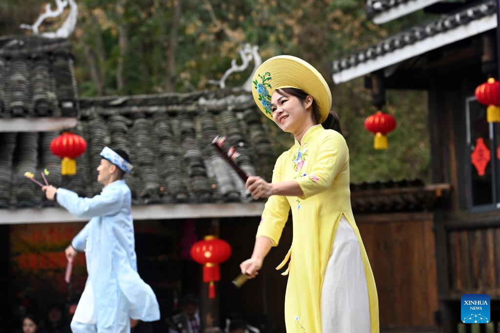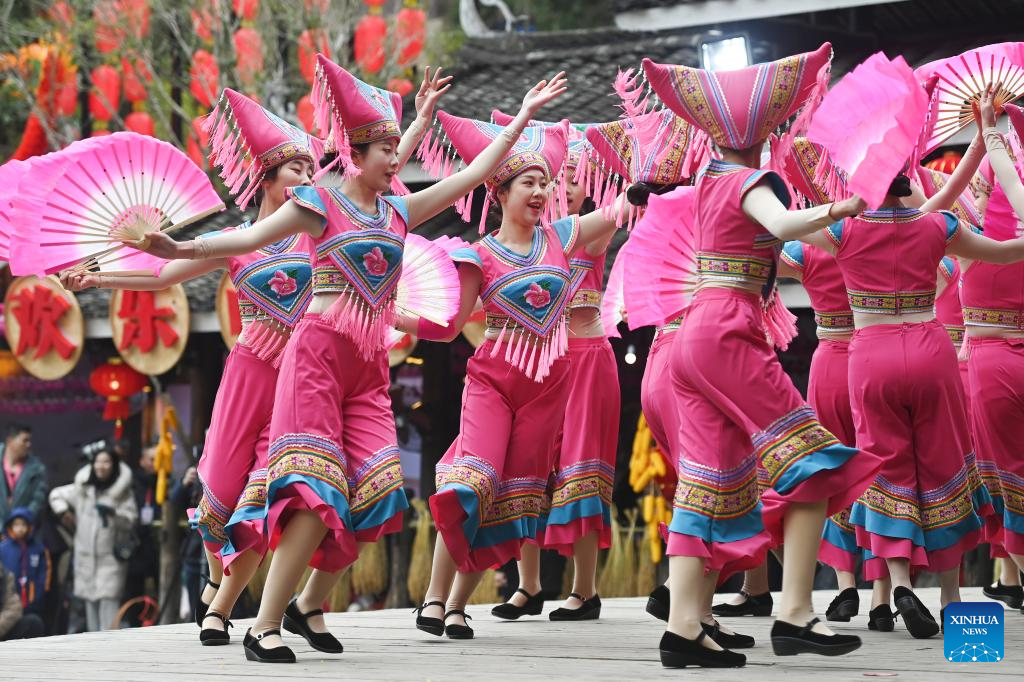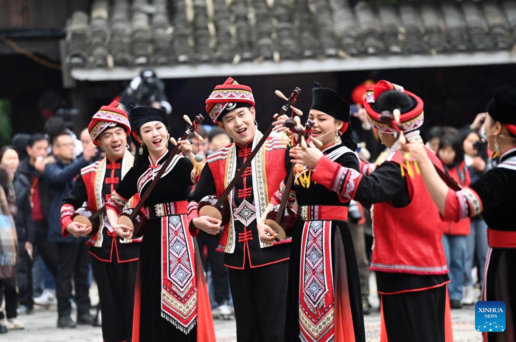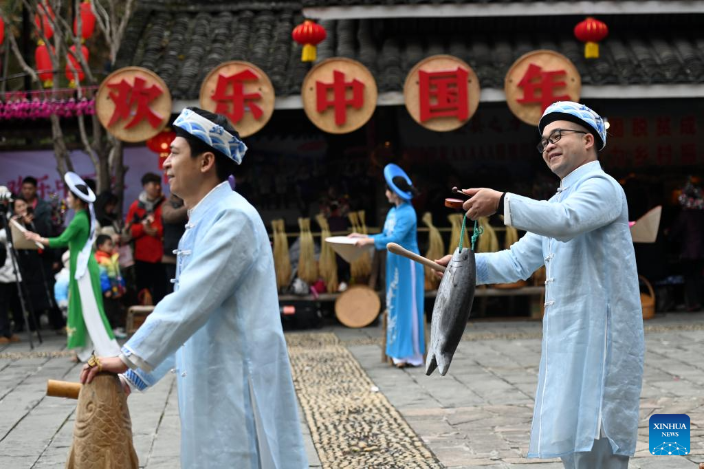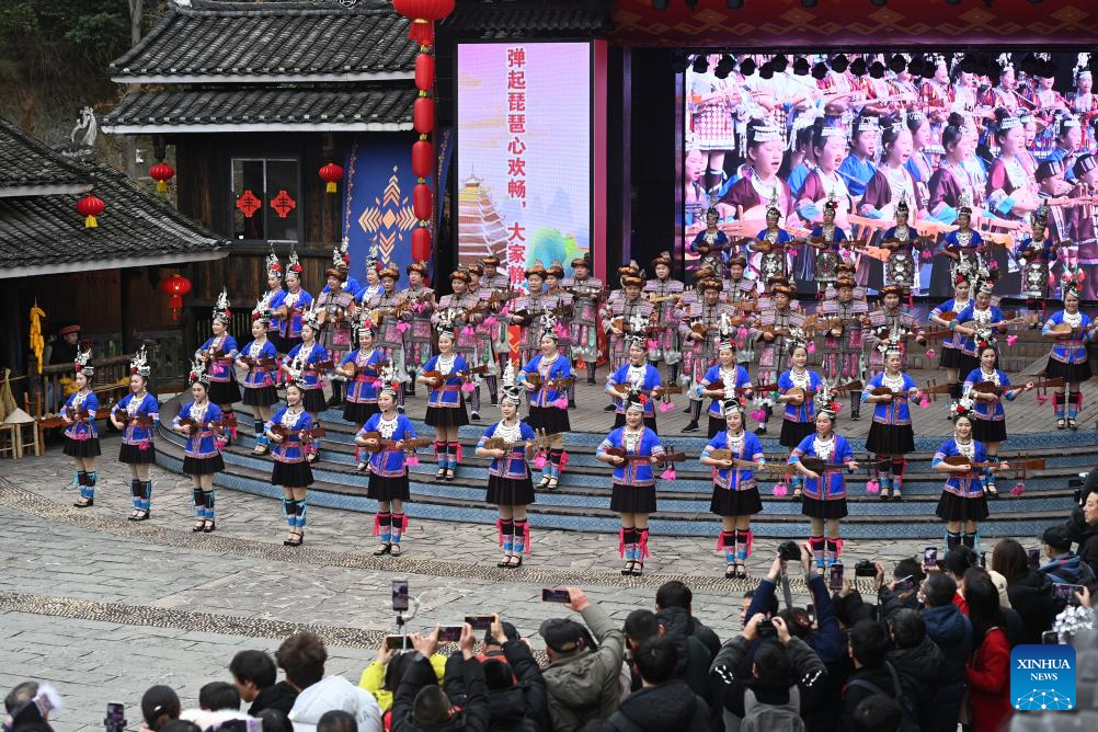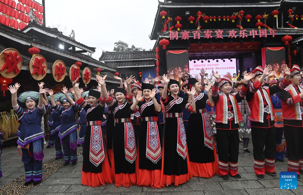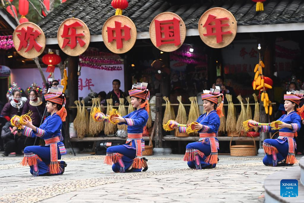 People perform during the "village gala" at a scenic spot in Sanjiang Dong Autonomous County, Liuzhou City of south China's Guangxi Zhuang Autonomous Region, Feb. 3, 2024. More than 1,200 people from 22 performing teams across Guangxi participated in the "village gala" to celebrate the upcoming Spring Festival. (Xinhua/Lu Boan)