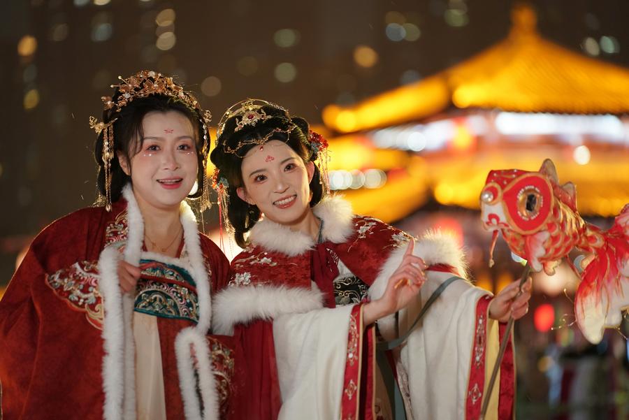 Tourists pose for photos at the Tang Paradise, a complex based on the site of the original relic of an imperial garden dating back to the Tang Dynasty (618-907), in Xi'an, capital of northwest China's Shaanxi Province, Feb. 2, 2024. (Xinhua/Shao Rui)