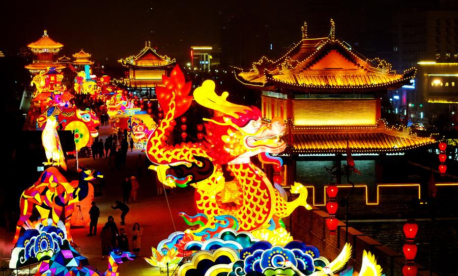 Tourists enjoy light decorations near the city wall of Xi'an, capital of northwest China's Shaanxi Province, Feb. 2, 2024. (Xinhua/Zou Jingyi)