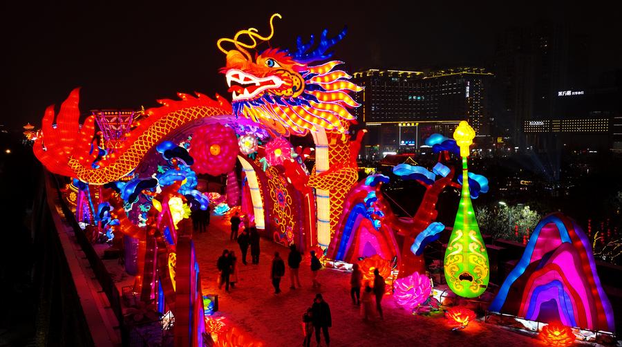 A drone photo taken on Feb. 2, 2024 shows light decorations near the city wall of Xi'an, capital of northwest China's Shaanxi Province. (Xinhua/Liu Xiao)