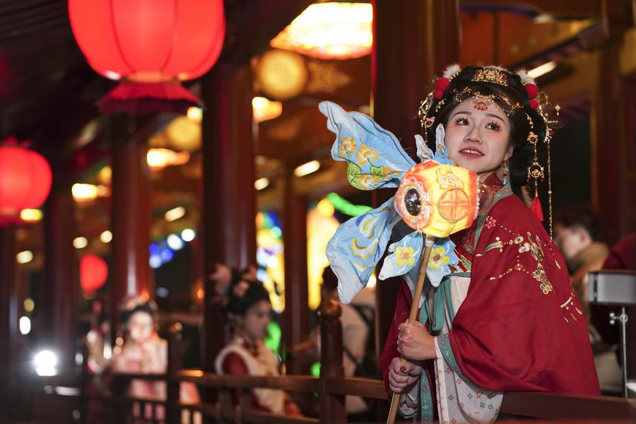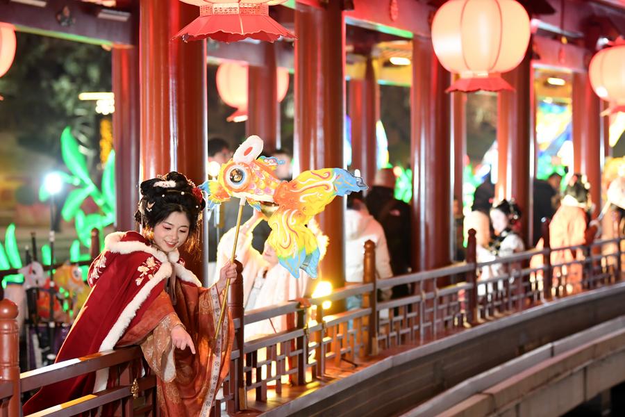 A tourist looks at light decorations at the Tang Paradise, a complex based on the site of the original relic of an imperial garden dating back to the Tang Dynasty (618-907), in Xi'an, capital of northwest China's Shaanxi Province, Feb. 2, 2024. (Xinhua/Shao Rui)