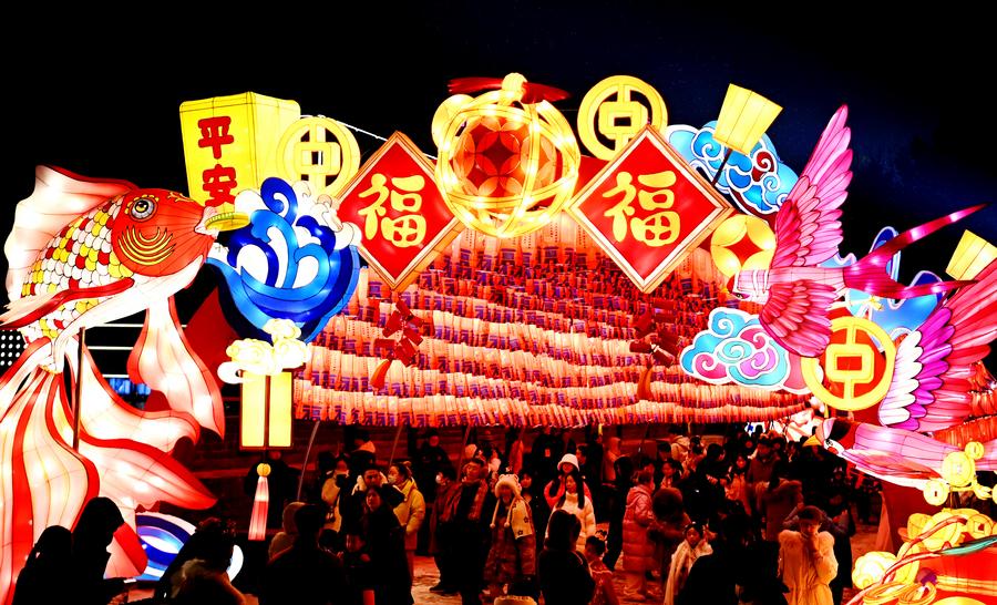 A light decoration is seen at the Tang Paradise, a complex based on the site of the original relic of an imperial garden dating back to the Tang Dynasty (618-907), in Xi'an, capital of northwest China's Shaanxi Province, Feb. 2, 2024. (Xinhua/Li Yibo)