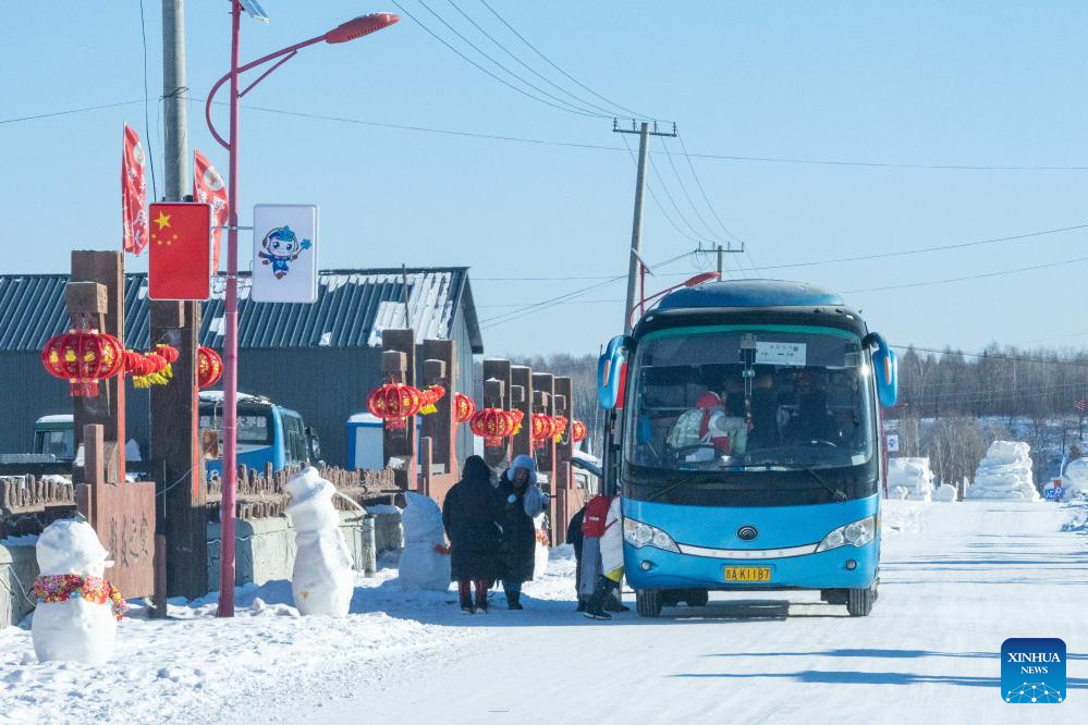 Tourists take a bus at Pingtai Village in Xunke County of Heihe, northeast China's Heilongjiang Province, Feb. 2, 2024. (Xinhua/Xie Jianfei)