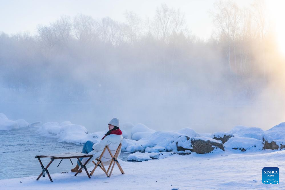 A tourist enjoys the rime scenery along the Kurbin River near Pingtai Village in Xunke County of Heihe, northeast China's Heilongjiang Province, Feb. 2, 2024. (Xinhua/Xie Jianfei)