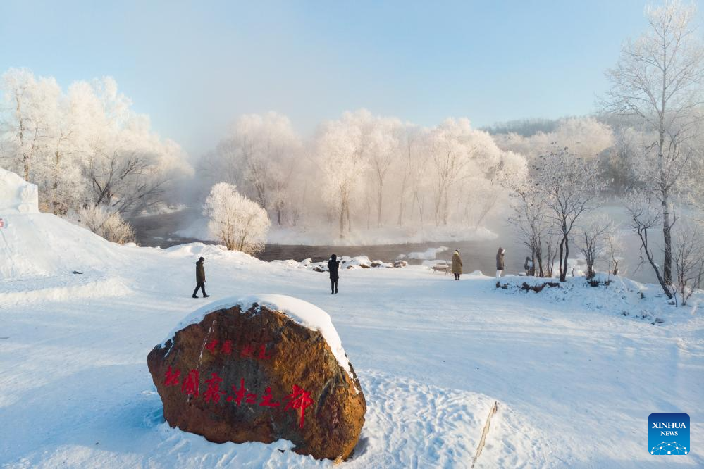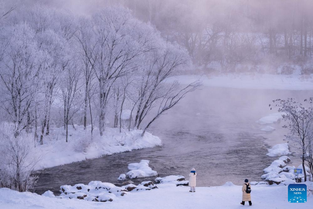 Tourists enjoy the rime scenery along the Kurbin River near Pingtai Village in Xunke County of Heihe, northeast China's Heilongjiang Province, Feb. 2, 2024. (Xinhua/Xie Jianfei)