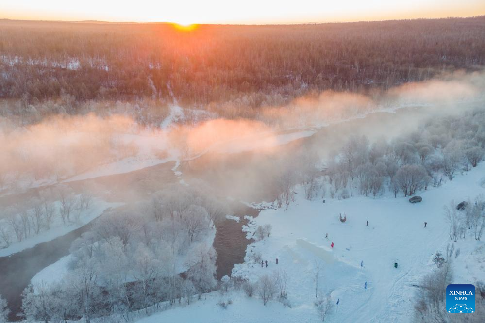 During harsh winter conditions, the supercooled water droplets from the Kurbin River rise and form rime on branches of trees along the bank when the river flows through Pingtai Village of Xunke County. This picturesque rime scenery attracts tourists from around the country.