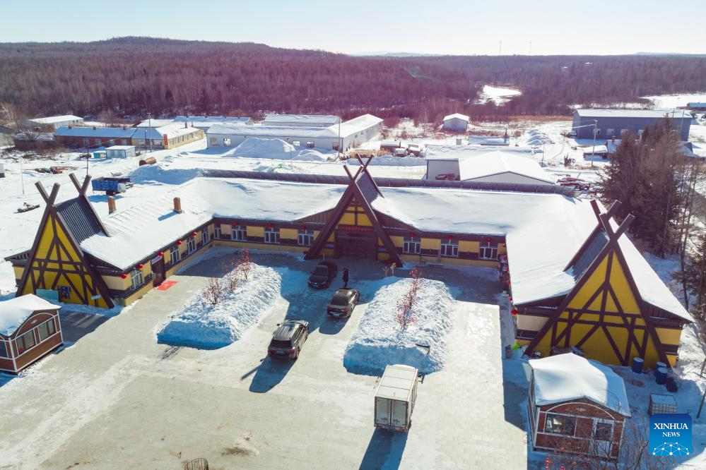 An aerial drone photo taken on Feb. 2, 2024 shows a tourist center of Pingtai Village in Xunke County of Heihe, northeast China's Heilongjiang Province. (Xinhua/Xie Jianfei)