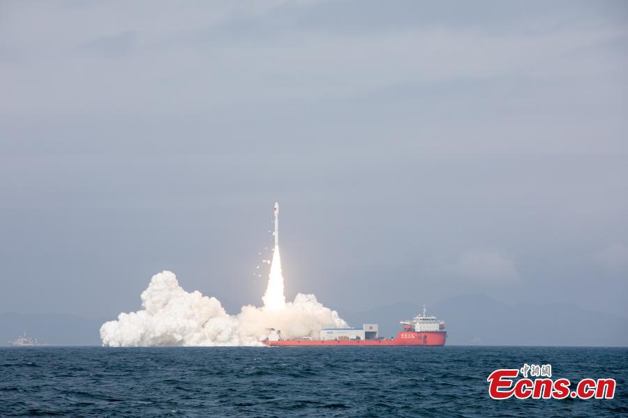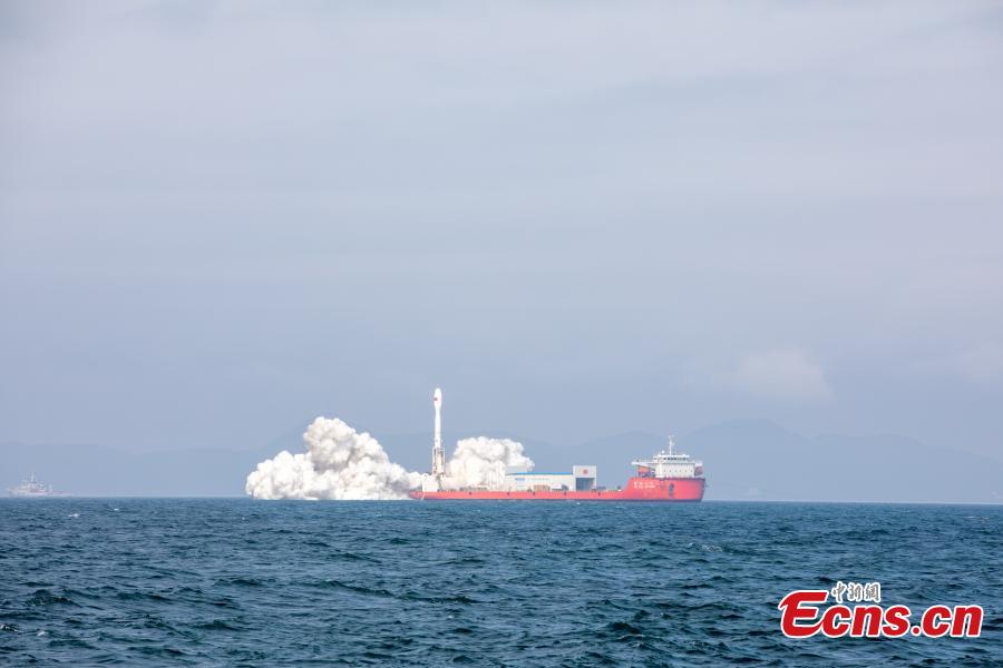 A Smart Dragon-3 carrier rocket carrying nine satellites blasts off from waters off the coast of Yangjiang, in south China's Guangdong Province, Feb. 3, 2024. (Photo: China News Service/An Di)