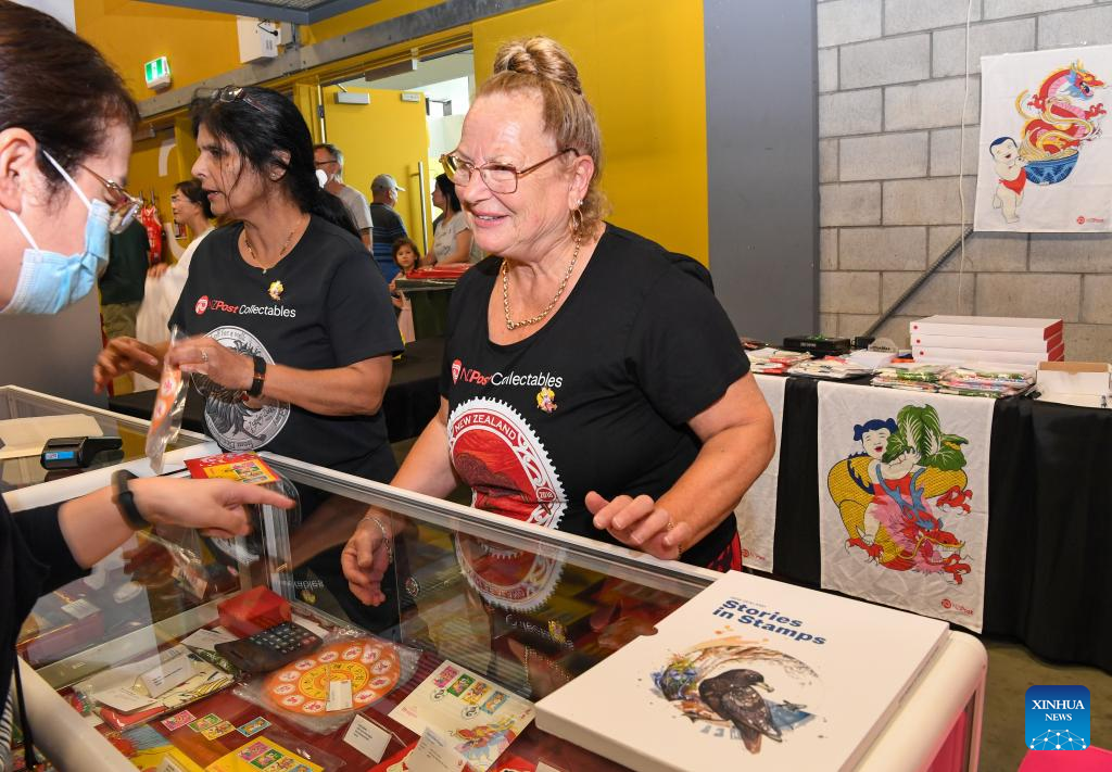 A customer (L) asks about the Year of the Dragon stamps for sale on the Chinese New Year Festival and Market Day in Auckland, New Zealand, Feb. 3, 2024. The Auckland Showgrounds burst forth with color and festivity on Saturday with the opening of the Chinese New Year Festival and Market Day, a signature event that has become a long-cherished tradition for various communities in New Zealand. (Xinhua/Guo Lei)