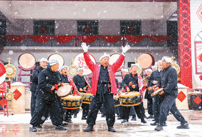 Members of a drum and gong troupe in Linfen, north China's Shanxi Province, rehearse for a village gala amid snow. (Photo courtesy of the organizer of the village gala)