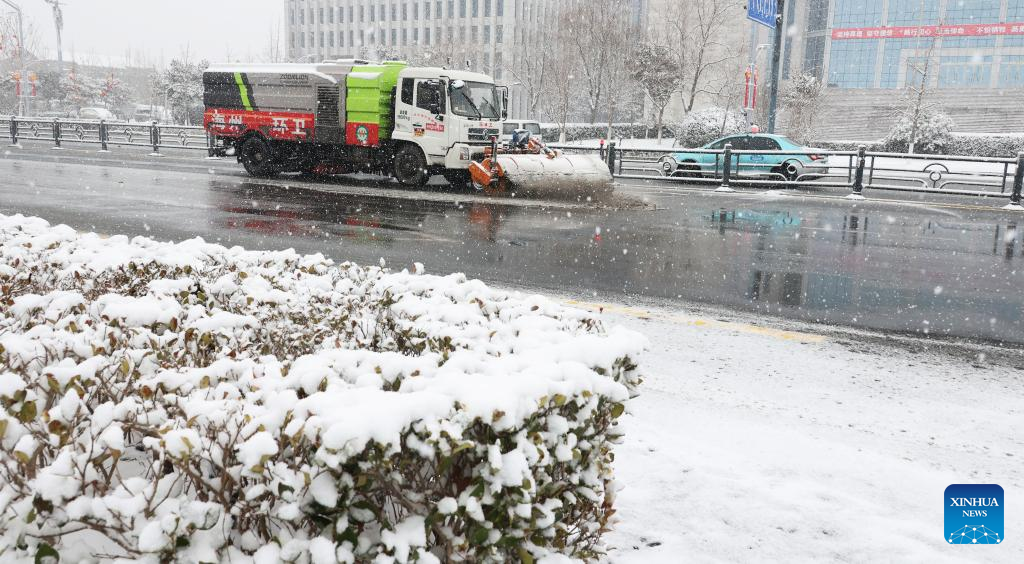 A staff member drives a snow sweeper to clear a road in Haizhou District of Lianyungang City, east China's Jiangsu Province, Feb. 4, 2024. Heavy snowfall has hit some areas of central and eastern China since Wednesday, leading to transport disruption amid the ongoing Spring Festival travel rush. (Photo by Geng Yuhe/Xinhua)
