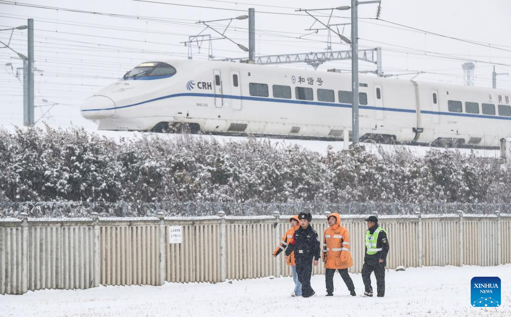 Policemen and high-speed railway infrastructure workers patrol the railway in Huai'an City, east China's Jiangsu Province, Feb. 4, 2024. Heavy snowfall has hit some areas of central and eastern China since Wednesday, leading to transport disruption amid the ongoing Spring Festival travel rush. (Photo by Zhao Qirui/Xinhua)