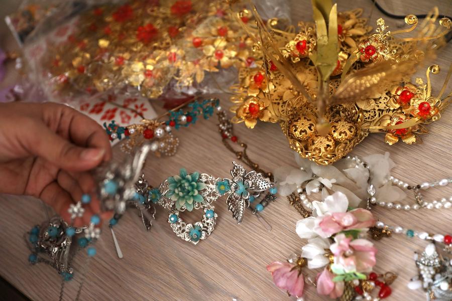 Wang Yanjuan arranges accessories used for "Dongbei Dagu" performance at home in Yingkou, northeast China's Liaoning Province, Feb. 1, 2024. (Xinhua/Yao Jianfeng)