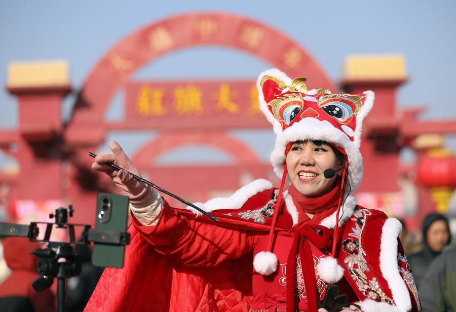 Wang Yanjuan stages a "Dongbei Dagu" show at a folk custom fair in Yingkou, northeast China's Liaoning Province, Feb. 2, 2024. (Xinhua/Yao Jianfeng)