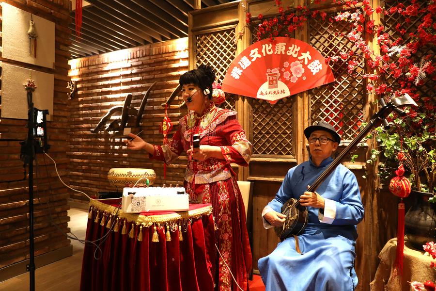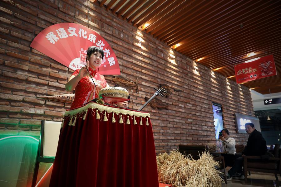 Wang Yanjuan stages a "Dongbei Dagu" show at a shopping mall in Yingkou, northeast China's Liaoning Province, Feb. 1, 2024. (Xinhua/Yao Jianfeng)