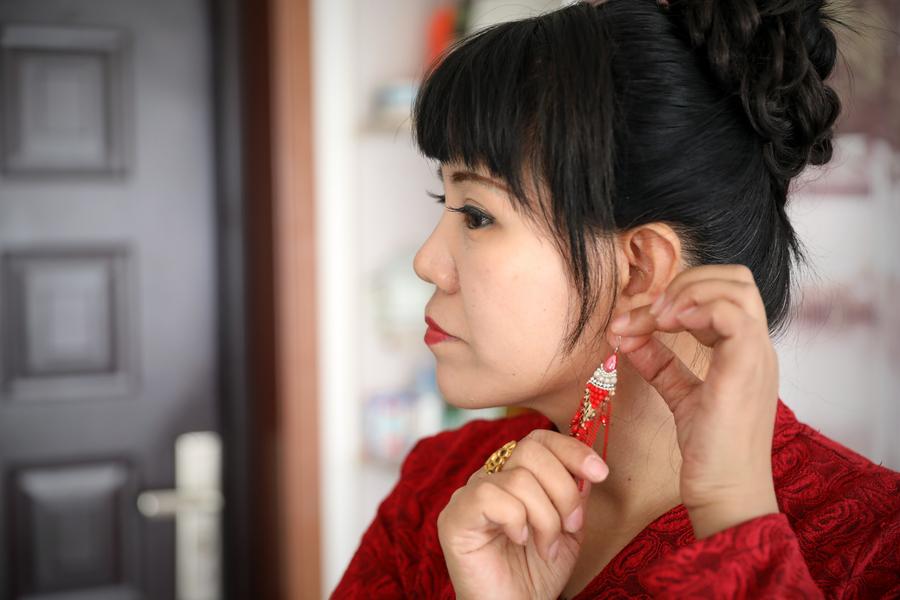 Wang Yanjuan wears earrings at home in Yingkou, northeast China's Liaoning Province, Feb. 1, 2024. (Xinhua/Yao Jianfeng)