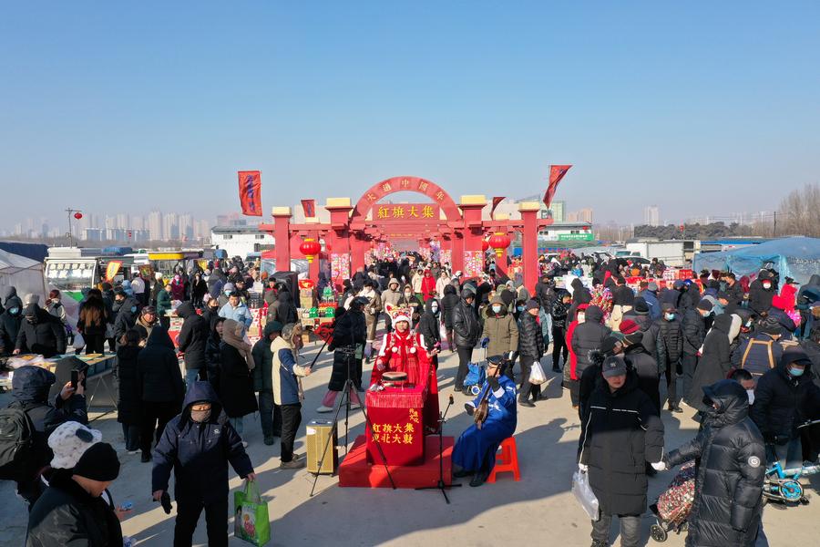 In this drone photo, Wang Yanjuan stages a "Dongbei Dagu" show at a folk custom fair in Yingkou, northeast China's Liaoning Province, Feb. 2, 2024. (Xinhua/Yao Jianfeng)