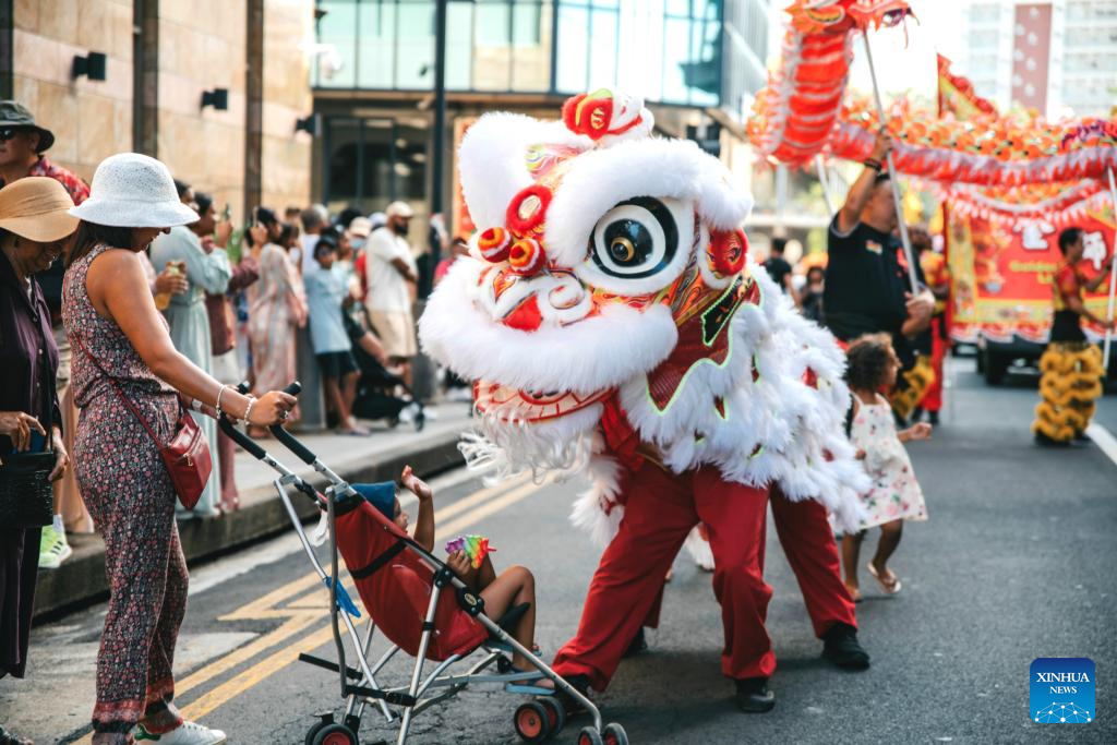 Lion dance performers interact with visitors during celebrations for the upcoming Chinese Lunar New Year in Port Louis, Mauritius, Feb. 3, 2024. (Chinese Embassy in Mauritius/Handout via Xinhua)