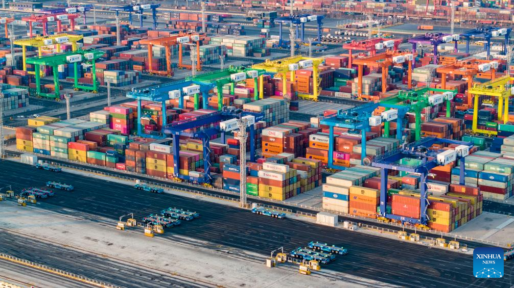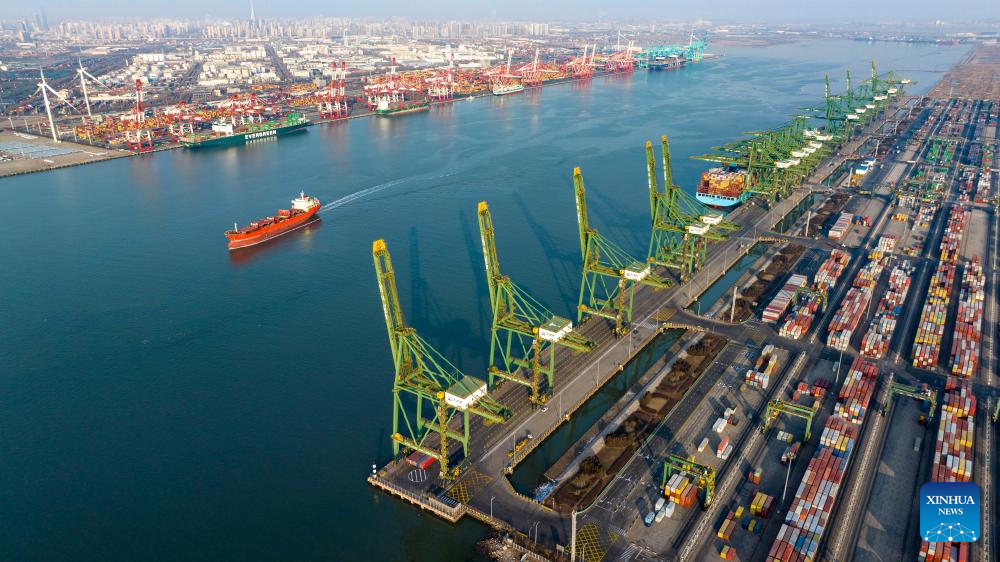 An aerial drone photo taken on Feb. 3, 2024 shows a container terminal of Tianjin Port in north China's Tianjin. Tianjin Port, located on the coast of the Bohai Sea, is a major shipping point in north China. (Xinhua/Zhao Zishuo)