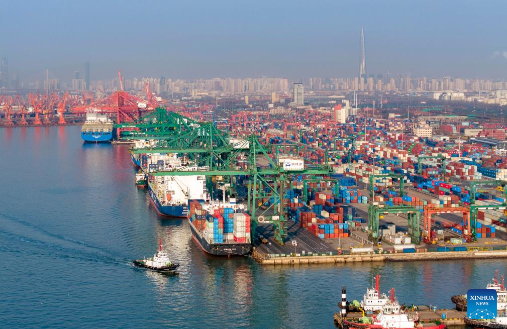 An aerial drone photo taken on Feb. 2, 2024 shows an international container terminal of Tianjin Port in north China's Tianjin. Tianjin Port, located on the coast of the Bohai Sea, is a major shipping point in north China. (Xinhua/Zhao Zishuo)