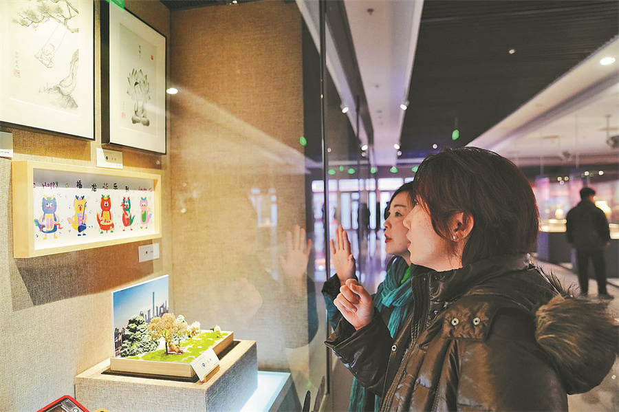 Works created under the Yuxun program on sale at the Gongmei Mansion in Wangfujing shopping area in downtown Beijing. [Photo/CHINA DAILY]