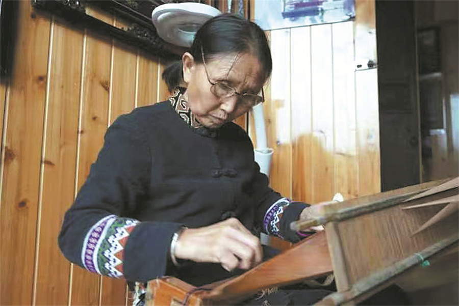 Liu Dai'e practices the traditional craft of Tujia brocade weaving in her home village in Longshan county, Hunan province. [Photo/CHINA DAILY]
