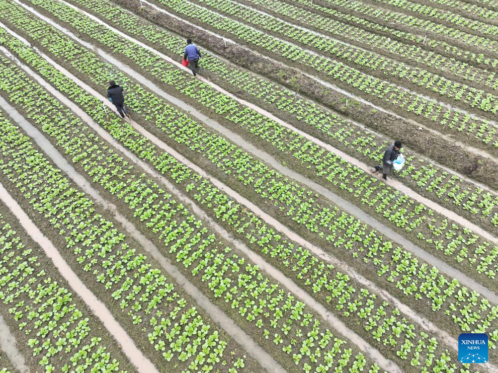 An aerial drone photo shows villagers working in a field in Mangtouzhai Village of Yongzhou City, central China's Hunan Province, Feb. 4, 2024. Sunday marks "Lichun", meaning the beginning of spring, the first solar term in the traditional Chinese lunar calendar. (Photo by Jiang Keqing/Xinhua)
