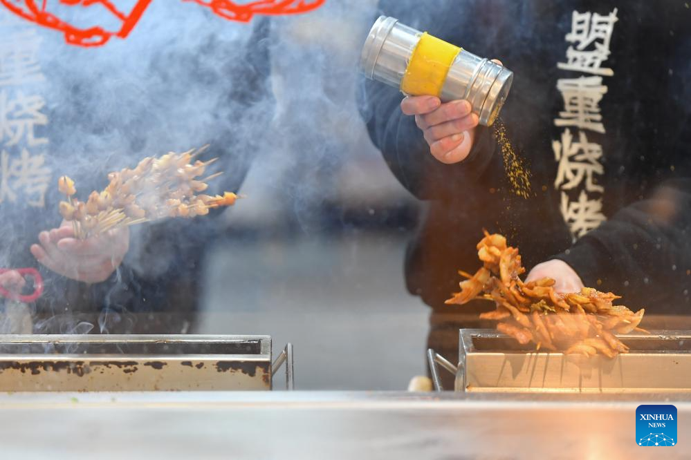 Staff members cook skewers at a stall in a night market selling street food in Changsha, central China's Hunan Province, Feb. 4, 2024. To attract more visitors, stalls in this night market are making innovations such as developing new products and promoting via social media. (Xinhua/Chen Zeguo)