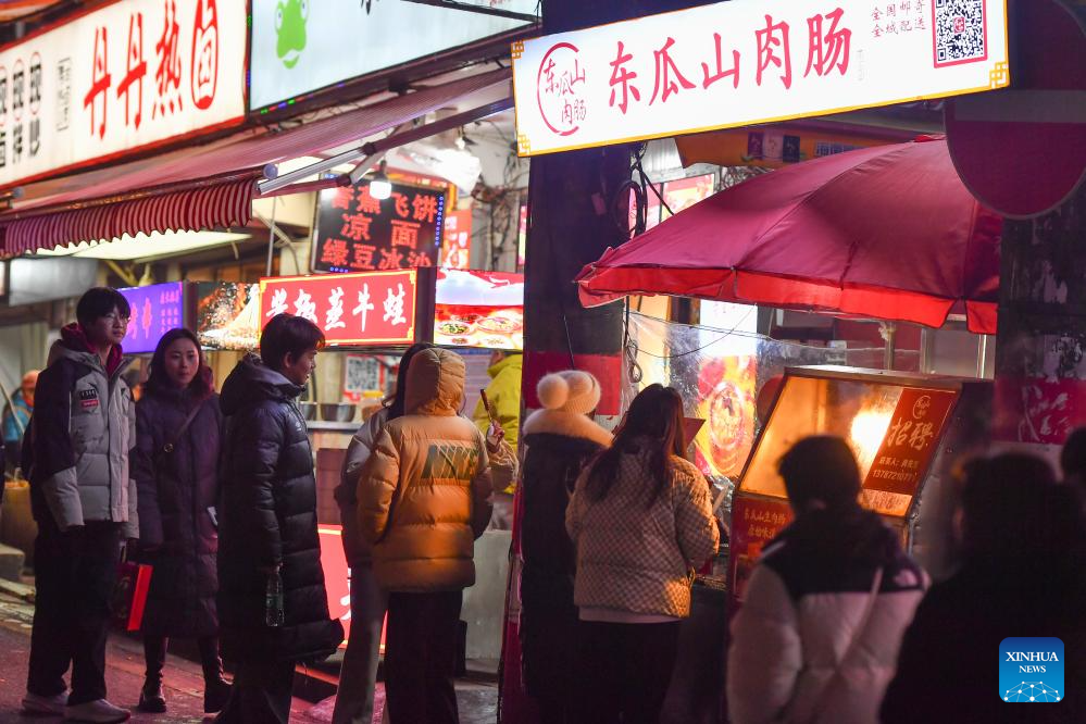 People buy snacks at a stall in a night market selling street food in Changsha, central China's Hunan Province, Feb. 4, 2024. To attract more visitors, stalls in this night market are making innovations such as developing new products and promoting via social media. (Xinhua/Chen Zeguo)