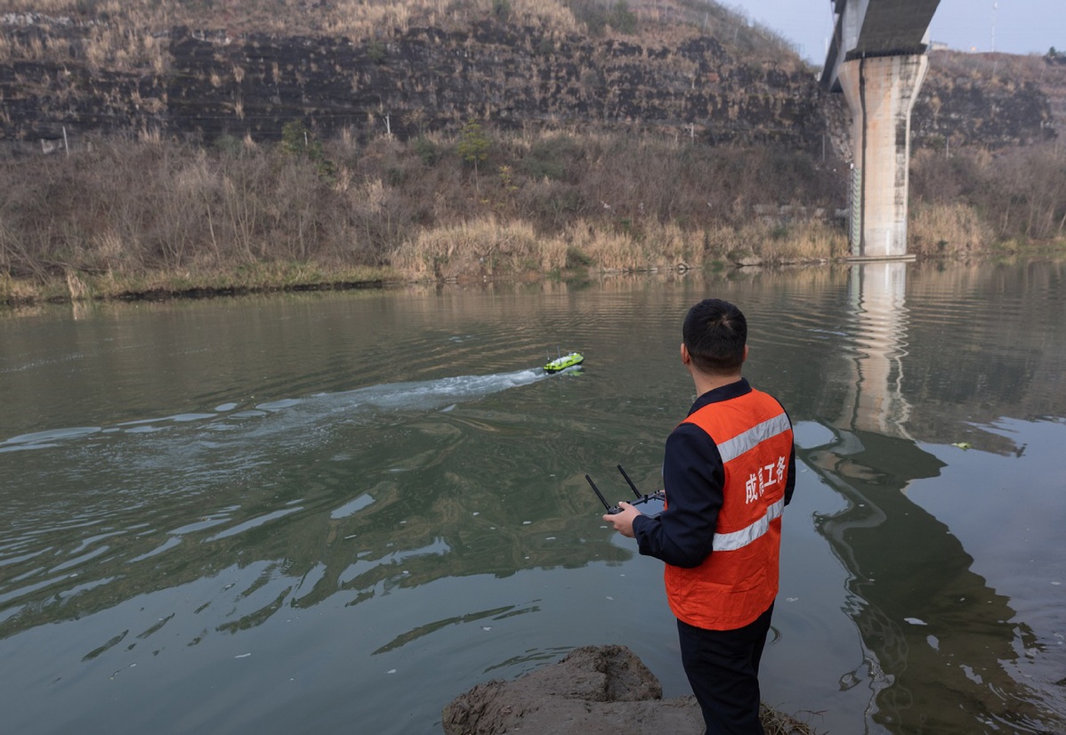 A worker operates an unmanned boat in Chengdu, Southwest China's Sichuan province, on Jan 27, 2024. [Photo/Xinhua]