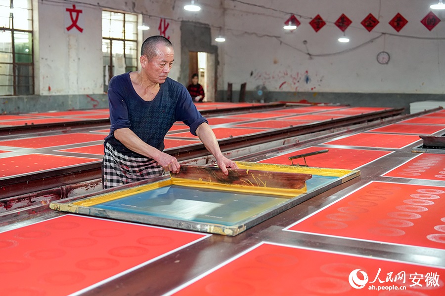 A worker makes Spring Festival couplets paper at a factory in Dingjiaqiao township, Jingxian county, east China's Anhui Province. (People's Daily Online/Miao Zijian)