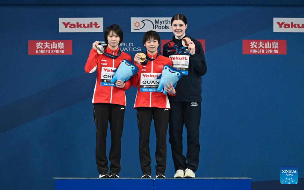 Gold medalist Quan Hongchan (C) of China, silver medalist Chen Yuxi (L) of China and bronze medalist Andrea Spendolini Sirieix of Britain pose during the awarding ceremony after the women's 10m platform final of diving at the World Aquatics Championships 2024 in Doha, Qatar, Feb. 5, 2024. (Xinhua/Xia Yifang)