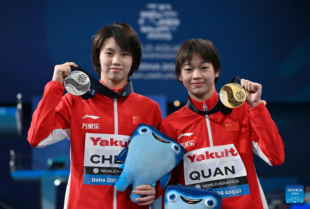 Quan Hongchan (R) and Chen Yuxi of China pose with their medals after the women's 10m platform final of diving at the World Aquatics Championships 2024 in Doha, Qatar, Feb. 5, 2024. (Xinhua/Xia Yifang)
