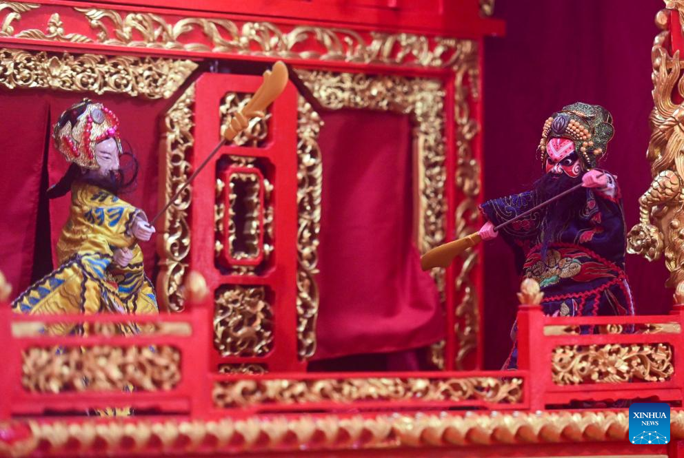 This photo taken on Feb. 3, 2024 shows a puppet show known as "wayang potehi" to greet the upcoming Chinese New Year at Mal Ciputra in Jakarta, Indonesia. (Xinhua/Zulkarnain)