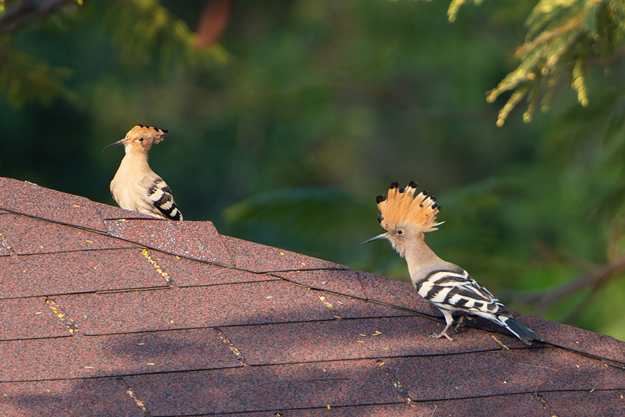 Two Eurasian hoopoes stand on rooftops in Xiamen, southeast China's Fujian Province. (Photo/Zhou Longjie)