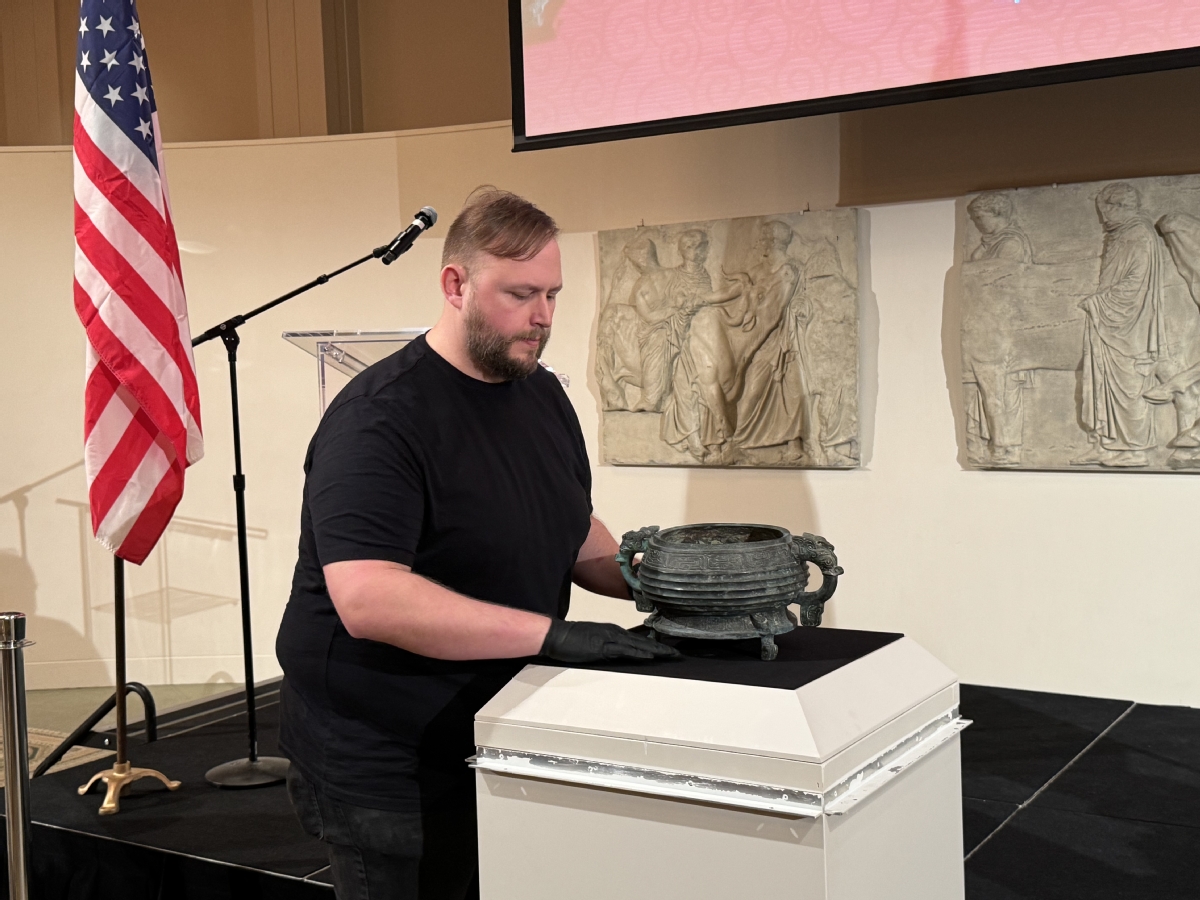 A staff member adjusts with great caution the bronze vessel "Feng Xingshu Gui" for a brief display at the Portland Art Museum on Jan 22, where a repatriation ceremony was held to welcome home the stolen Chinese relic. CHANG JUN / CHINA DAILY