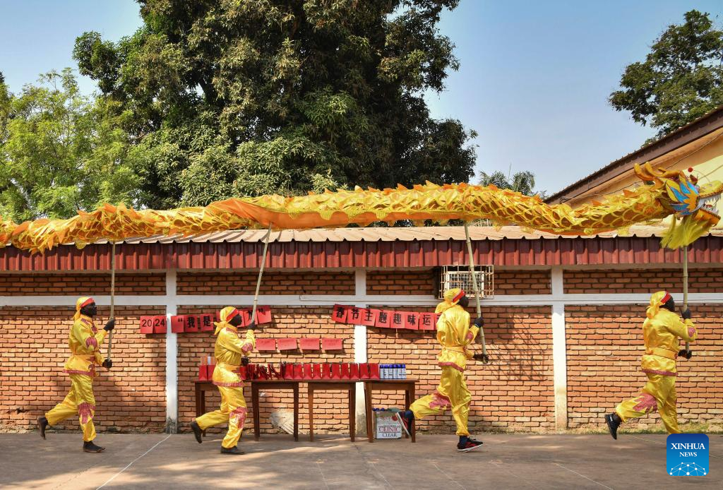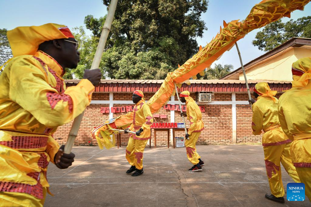 Students perform dragon dance during a cultural event at the Confucius Institute of Bangui University in Bangui, Central African Republic, Feb. 6, 2024. The Confucius Institute of Bangui University held a cultural event on Tuesday, celebrating the upcoming Chinese Lunar New Year, or the Spring Festival. (Xinhua/Han Xu)