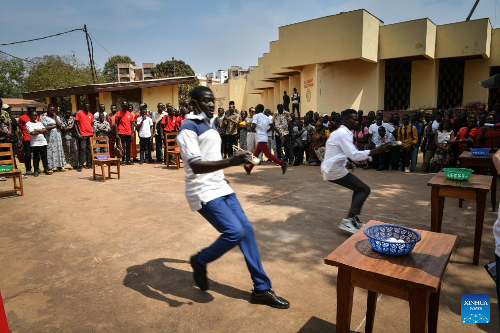 Students participate in a game, carrying Ping Pong with chopsticks, during a cultural event at the Confucius Institute of Bangui University in Bangui, Central African Republic, Feb. 6, 2024. The Confucius Institute of Bangui University held a cultural event on Tuesday, celebrating the upcoming Chinese Lunar New Year, or the Spring Festival. (Xinhua/Han Xu)