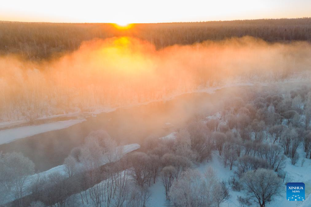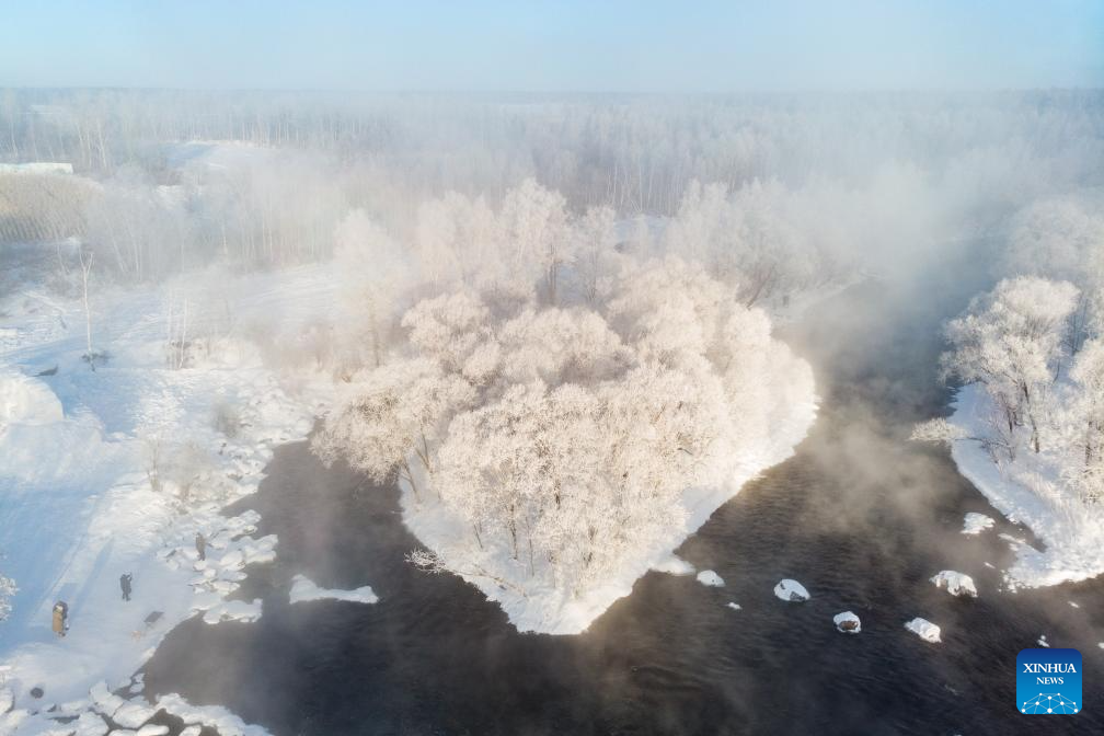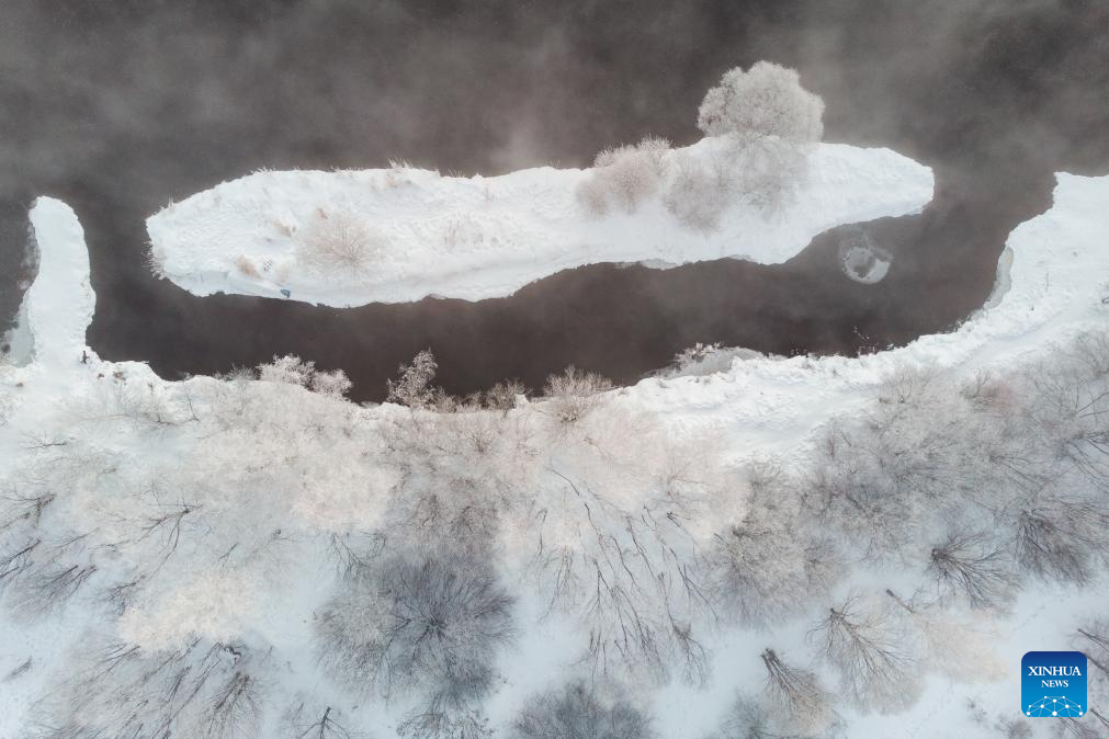 An aerial drone photo taken on Feb. 2, 2024 shows the rime scenery near Pingtai Village of Kelin Township, Xunke County, northeast China's Heilongjiang Province. (Xinhua/Xie Jianfei)