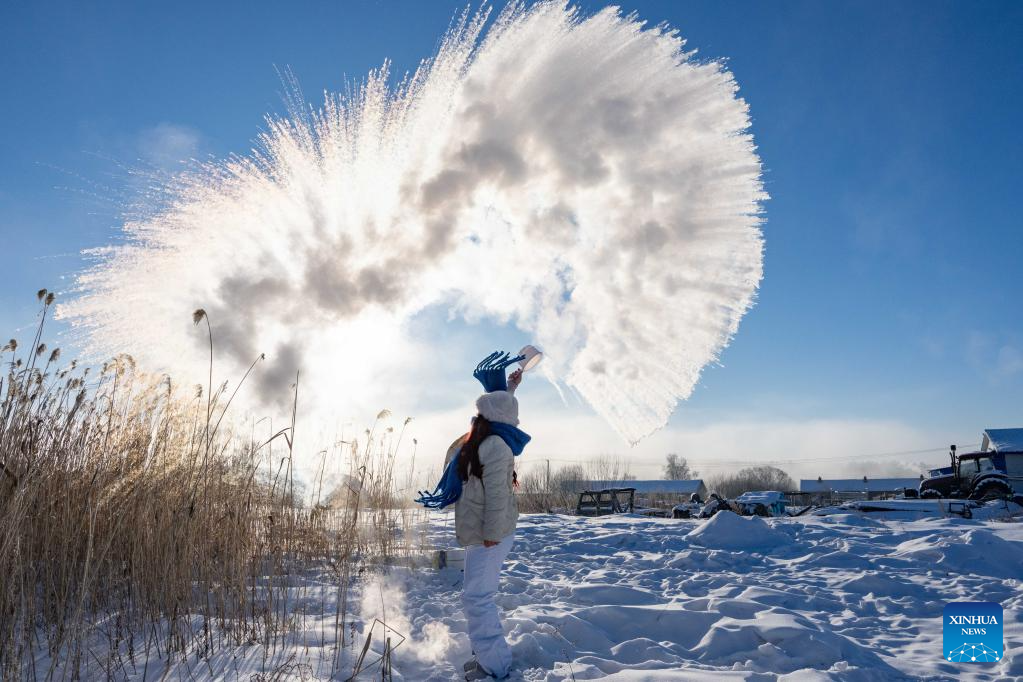 A tourist sprays water and poses for photos in Pingtai Village of Kelin Township, Xunke County, northeast China's Heilongjiang Province, Feb. 2, 2024. (Xinhua/Xie Jianfei)