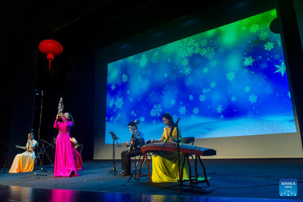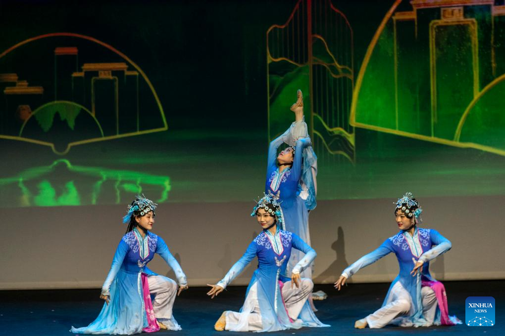Performers are seen on the stage at the Municipal Theatre of Piraeus for the upcoming Chinese New Year in Piraeus, Greece, Feb. 6, 2024. (Xinhua/Marios Lolos)