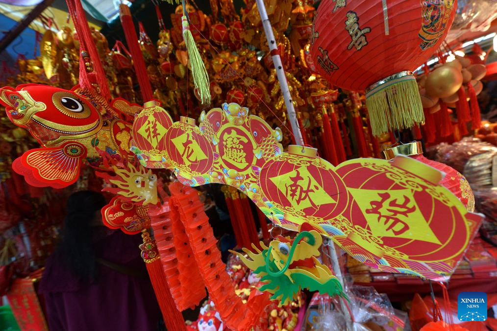 Spring Festival decorations are displayed at a store in the Chinatown of Bangkok, Thailand, Feb. 8, 2024. (Xinhua/Rachen Sageamsak)