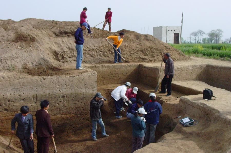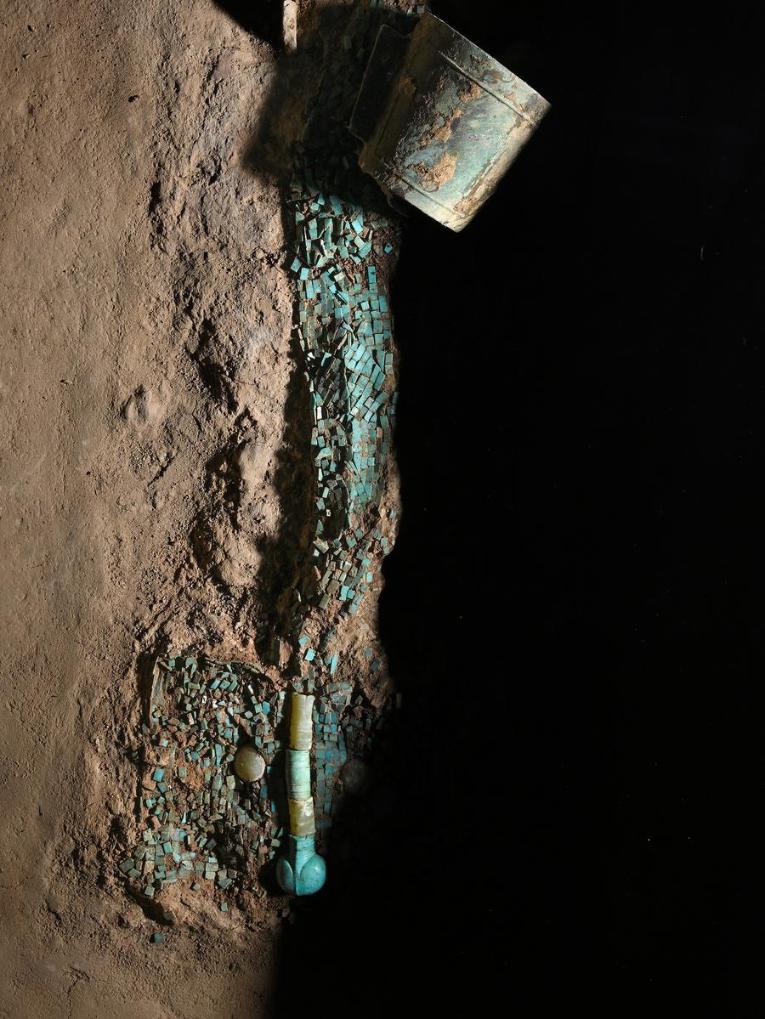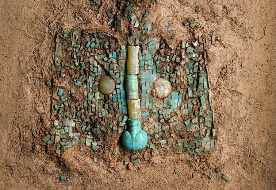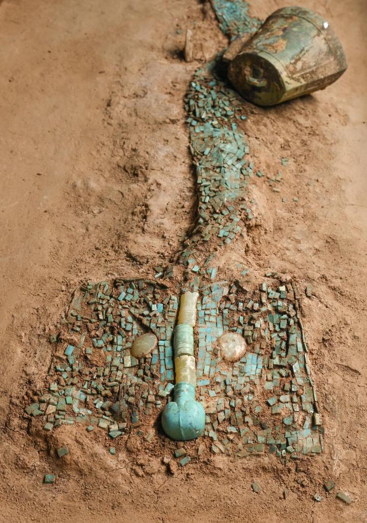 This undated file photo shows the excavation of a turquoise dragon-form artifact at Erlitou site in Luoyang, central China's Henan Province. (IA CASS/Handout via Xinhua)