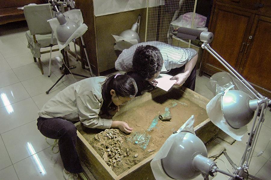 This undated file photo shows archaeologists working on a turquoise dragon-form artifact at Institute of Archaeology under the Chinese Academy of Social Sciences (IA CASS) in Beijing, capital of China. (IA CASS/Handout via Xinhua)
