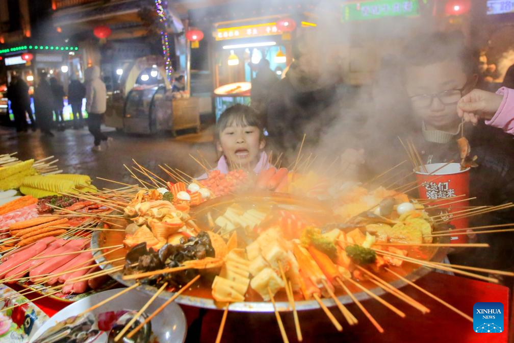 Children eat snacks at a night market in the ancient city of Kashgar, northwest China's Xinjiang Uygur Autonomous Region, Feb. 4, 2024.