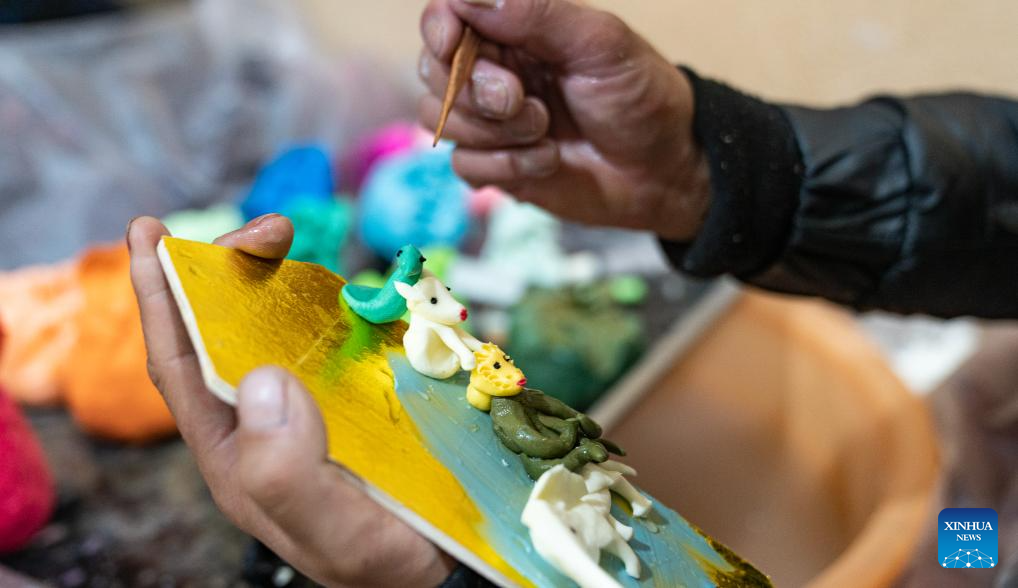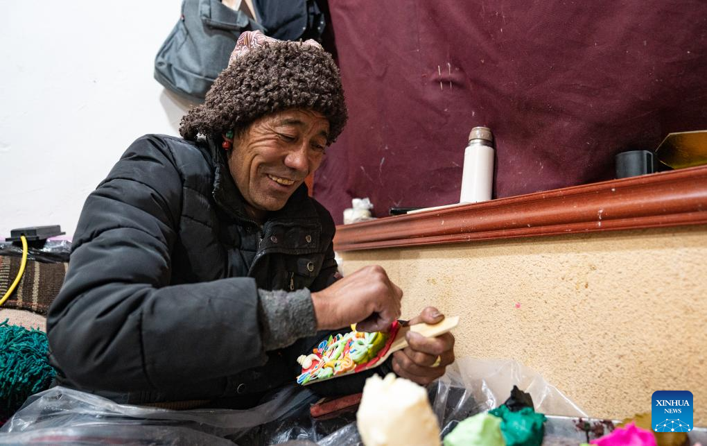 A craftsman makes butter sculptures in Lhasa, southwest China's Xizang Autonomous Region, Feb. 7, 2024. The Tibetan New Year coincides with the Lunar New Year, or the Spring Festival, which falls on Feb. 10 this year. As the New Year is approaching, butter sculptures handmade by local craftsmen sell quite well in Xizang. (Xinhua/Tenzin Nyida)